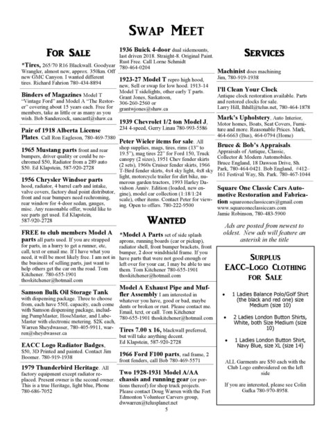 “Vintage Ford” and Model A “The Restor- 306-260-2560 or and restored clocks for sale.